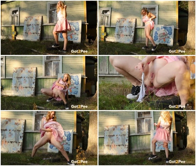 Alice is squatting to pee and holds onto her panties while soaking them in her juices!